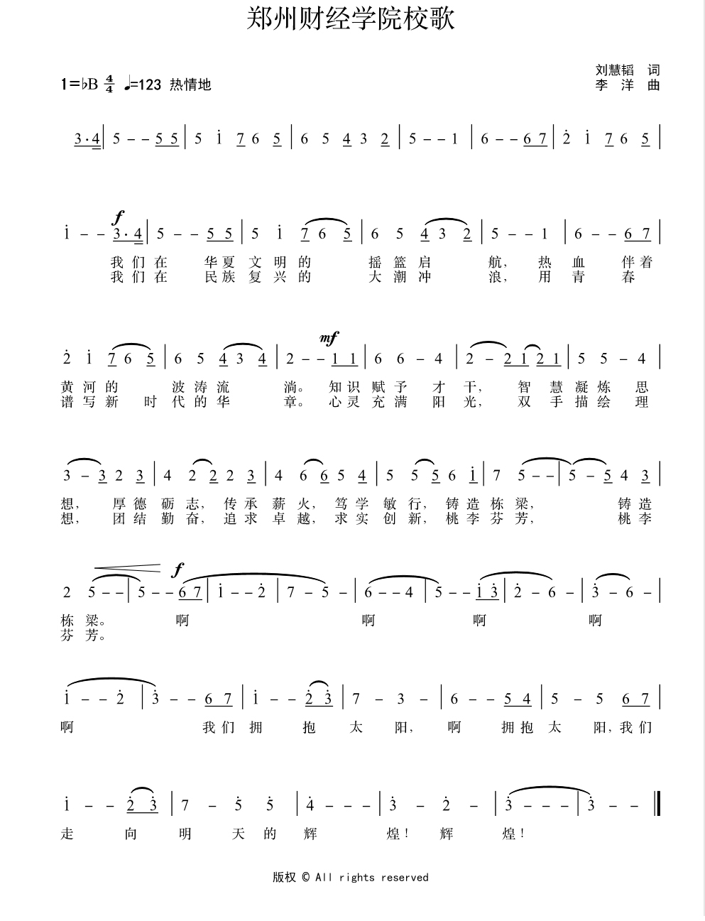 “我们在华夏文明的摇篮启航,热血伴着黄河的波涛流淌” “知识赋予才干,智慧凝练思想” “厚德砺志 传承薪火” “笃学敏行 铸造栋梁” “我们拥抱太阳,走向明天的辉煌” “第二段:“我们在民族复兴的大潮冲浪,青春谱写新时代的华章” “心灵充满阳光,双手描绘理想” “团结勤奋,追求卓越” “求实创新,桃李芬芳” “我们拥抱太阳,走向明天的辉煌” |